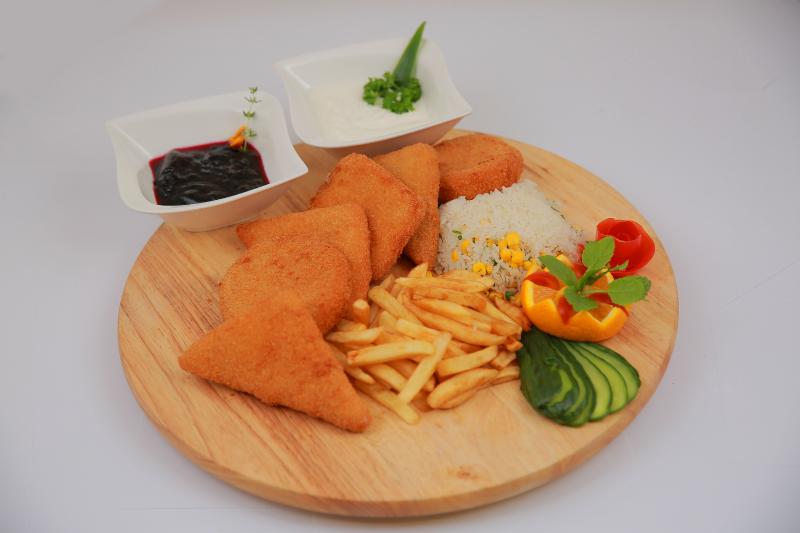 (1 rántott csirkemell, 1 párizsi szelet, 1 rántott camembert, 1 rántott sajt, 1 Cordon Bleu, 2 öntet)