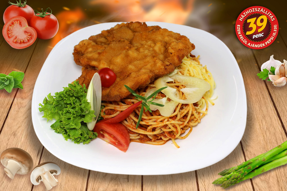 (milánói spagetti, rántott csirkemell)