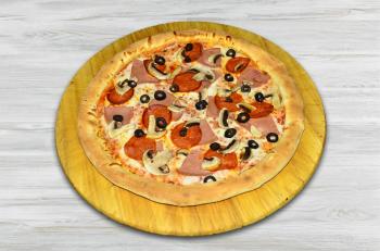 (pizzaszósz, sonka, kolbász, gomba, olívabogyó, mozzarella)